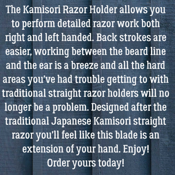 The Kamisori Razor Holder allows you to perform detailed razor work both right and left handed. Back strokes are easier, working between the beard line and the ear is a breeze and all the hard areas you’ve had trouble getting to with traditional straight razor holders will no longer be a problem. Designed after the traditional Japanese Kamisori straight razor you’ll feel like this blade is an extension of your hand. Enjoy!